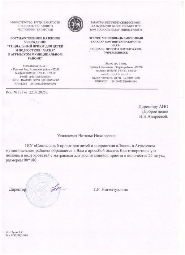 Мы, обращаемся к вам с важной просьбой. В детсом приюте "Ласка" находится много замечательных детей, которые нуждаются в уюте и заботе. К сожалению, у них не хватает кроватей и матрасов, чтобы обеспечить комфортный отдых для маленьких подопечных.