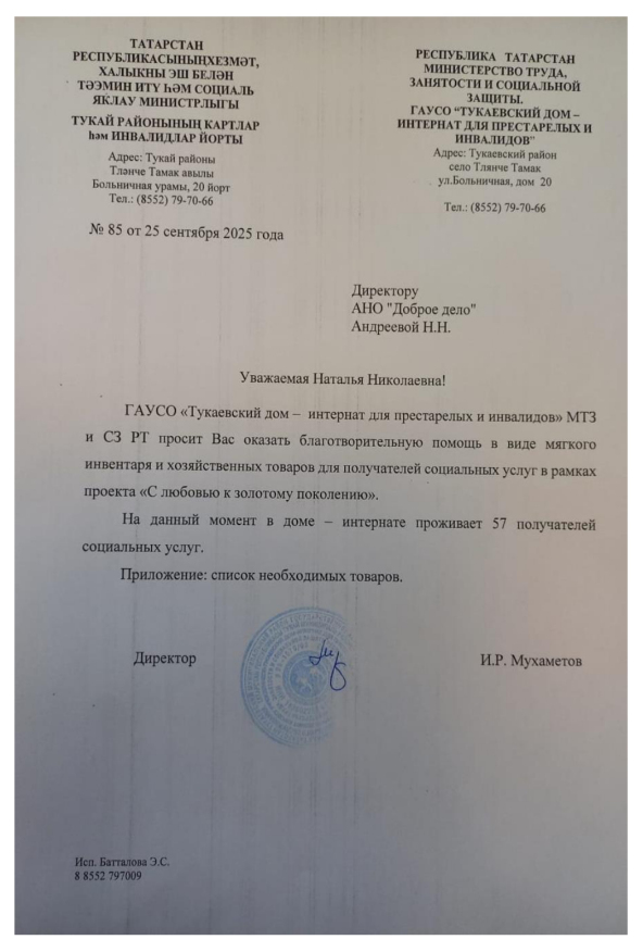 С каждым днем наше «золотое поколение» становится все более уязвимым. Мы приглашаем вас принять участие в нашей благотворительной акции «С любовью к золотому поколению» для ГАУСО “Тукаевский дом-интернат для престарелых и инвалидов”, чтобы подарить тепло, заботу и внимание тем, кто нуждается в нашей помощи.